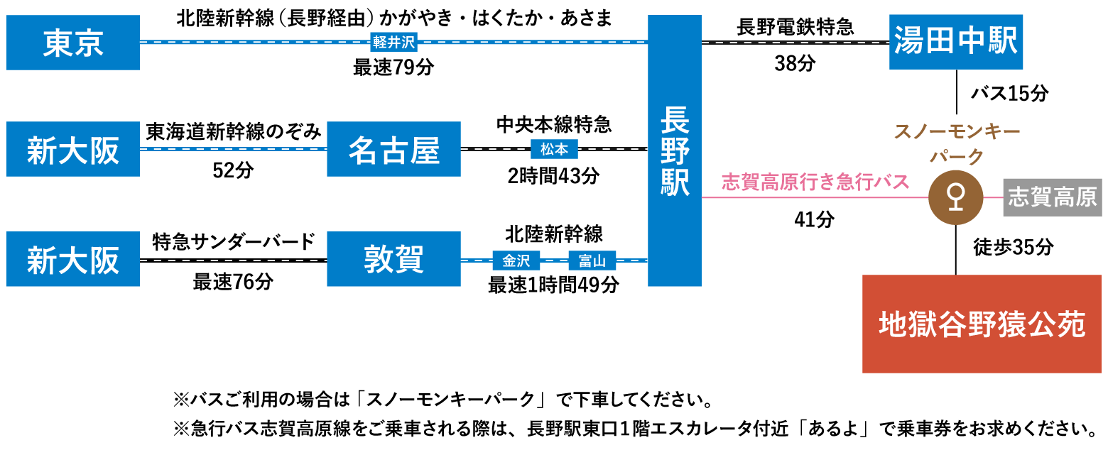 - 夏季は長野電鉄湯田中駅よりタクシーで地獄谷駐車場を経由する方法もございます。
