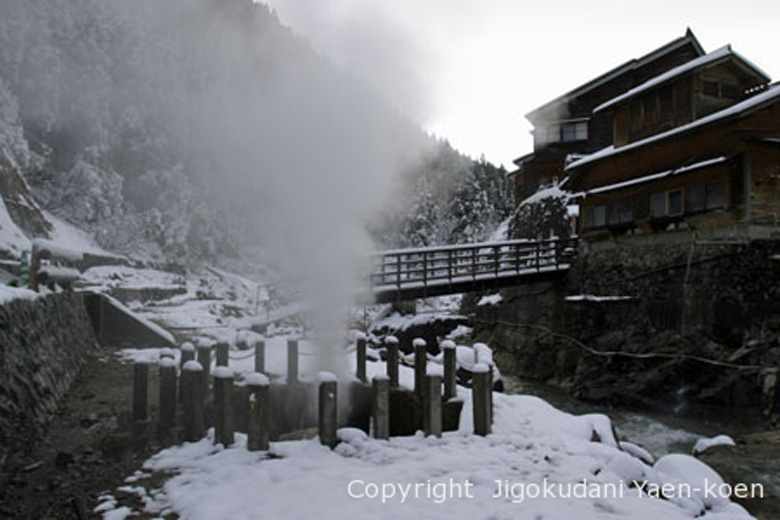 地獄谷の温泉は横湯川の河床から自然湧出している温泉を集め利用されています。渋温泉、上林温泉へも供給されています。弱食塩泉で無色透明です。写真の建物は文久4年(1864年)に開かれた歴史ある湯治宿で現在も後楽館として営業を続けています。