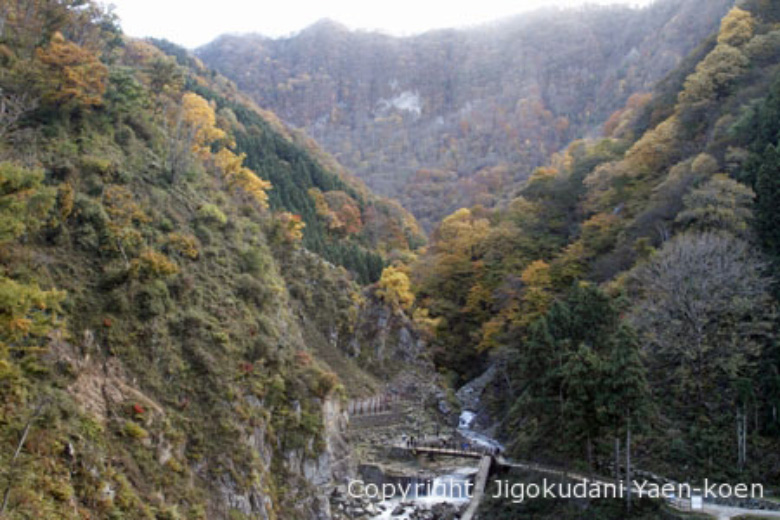 地獄谷を流れる横湯川は志賀高原の大沼池を源とし、諸渓流と合流し夜間瀬川、千曲川、信濃川となり日本海に流れ下っています。地獄谷の景観はその横湯川の浸食により形作られています。