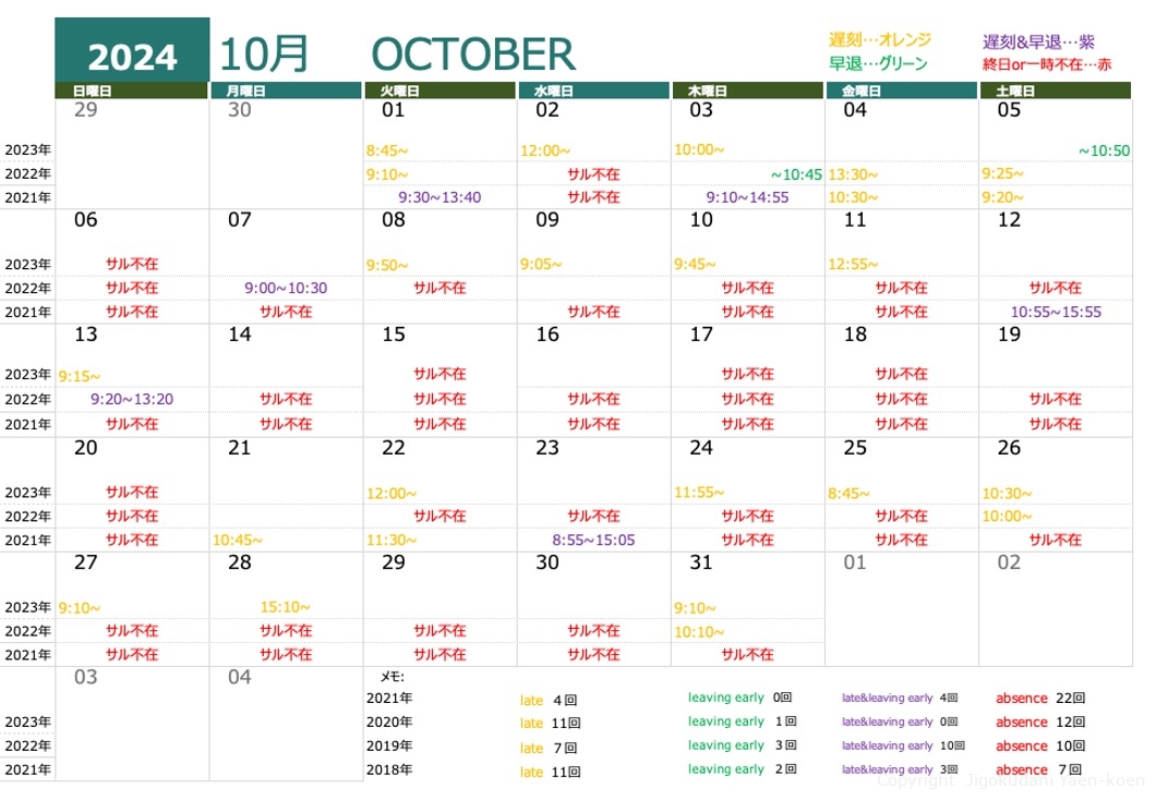 9月中旬からサルたちの遅刻・早退・終日不在の発生率が高くなっています。