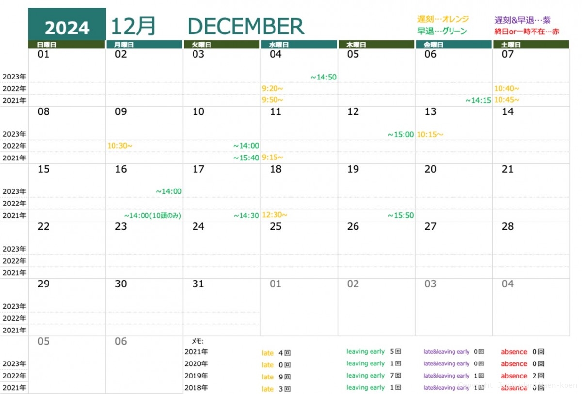 以下は過去3年間のサルたち出勤状況を記したカレンダーです。ご参考ください。