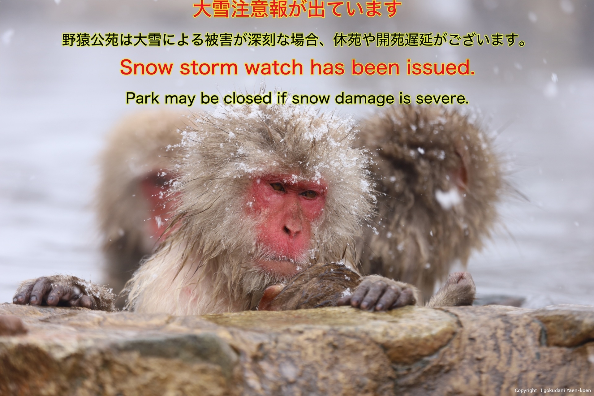 ・道中・野猿公苑内にて雪崩や倒木の発生。この場合は、行政による倒木・雪の撤去を依頼し、撤去後に通行していただくことになります。多くの場合は、9:00〜10:00くらいに撤去が完了し10:00〜11:00頃より開苑いたします。(発生確率は高め)