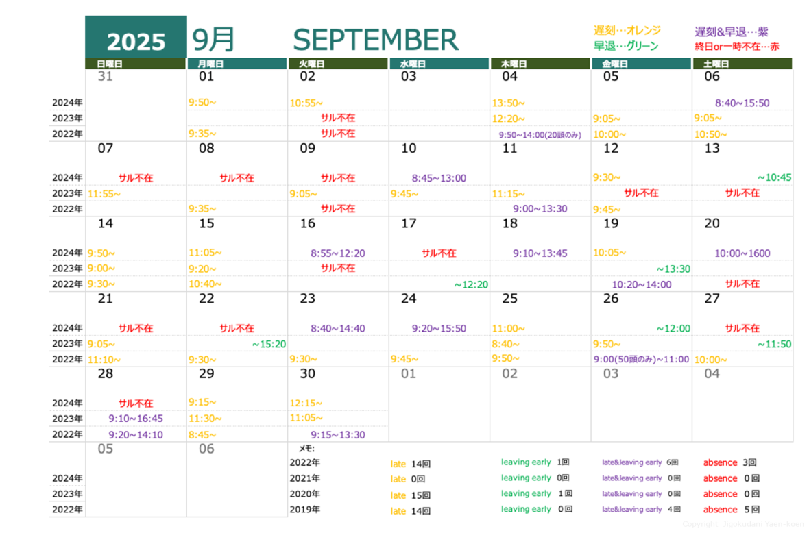 以下、過去の9月のサルたち出勤データです。合わせてご参考ください。