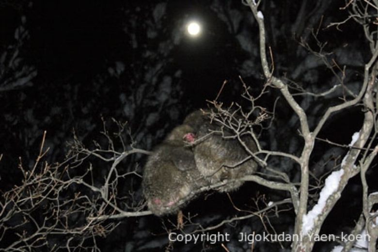 ニホンザルは特定の巣(ねぐら)を持ちません。毎日、泊まり場(寝る場所)は変わります。外敵に襲われにくい急斜面の森を泊まり場にします。季節や天候に よっても変わります。樹上や木の根元、岩場などで、親子や兄弟姉妹、仲の良いもの同士が数頭で身を寄せ合い、あるいは単独で、しゃがんで手足を抱えた姿勢 で眠ります。