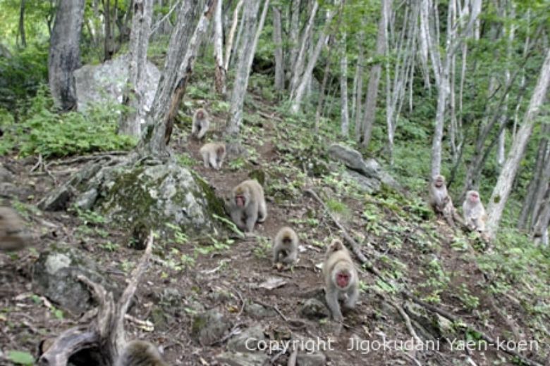 野猿公苑に来るサルたちは、夜が明けるころから行動を始め、しばしの間、行動範囲の森林を移動しながら、採食や休息をしてから野猿公苑に現れます。日中は野猿公苑で エサをもらい、休息したりしてのんびり過ごします。夕方近くになると移動を始め、野猿公苑を離れ、暗くなるまで移動しながら採食します。そして、暗くなる ころには泊り場を決め、暗くなると眠りにつきます。そのような行動を毎日繰り返します。サルたちにとって野猿公苑は行動範囲の中でも、いつでも食べ物が得られる特別な場所なのです。